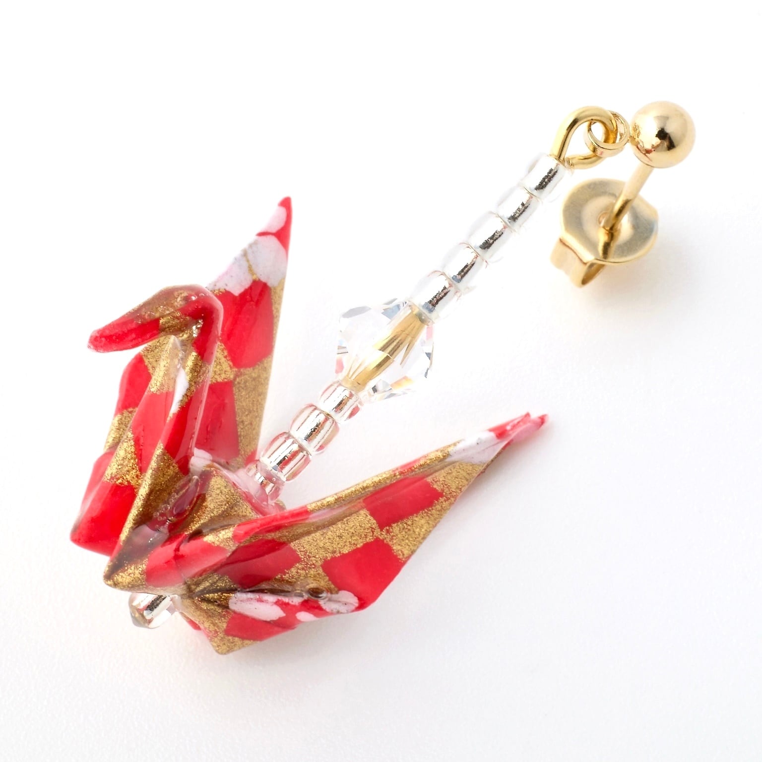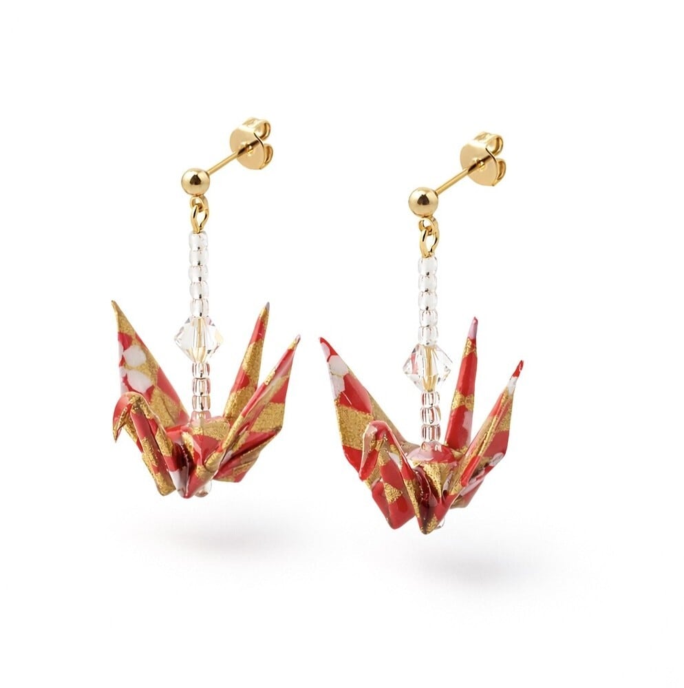 折り鶴ピアス(クリスタル付)|赤